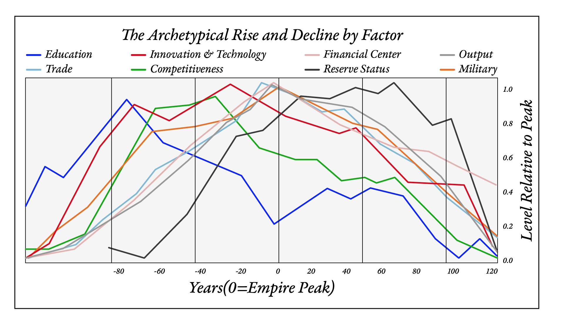 The explanation of the rise of great nations beginning with strong education systems, and the identification of the Rise, Top, and Decline phases of empires, is from Ray Dalio's Principles for Dealing with the Changing World Order.